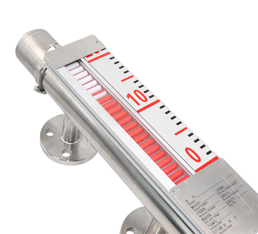 液位計(jì)根據(jù)浮力原理,浮子在測量管內(nèi)隨液位的升降而上下移動,浮子內(nèi)的永久磁鋼通過磁合作用,驅(qū)動紅、白色翻柱翻轉(zhuǎn)180液位上升時,翻柱由白色轉(zhuǎn)為紅色,下降時,翻柱由紅色轉(zhuǎn)為白色,從而實(shí)現(xiàn)液位的指示。